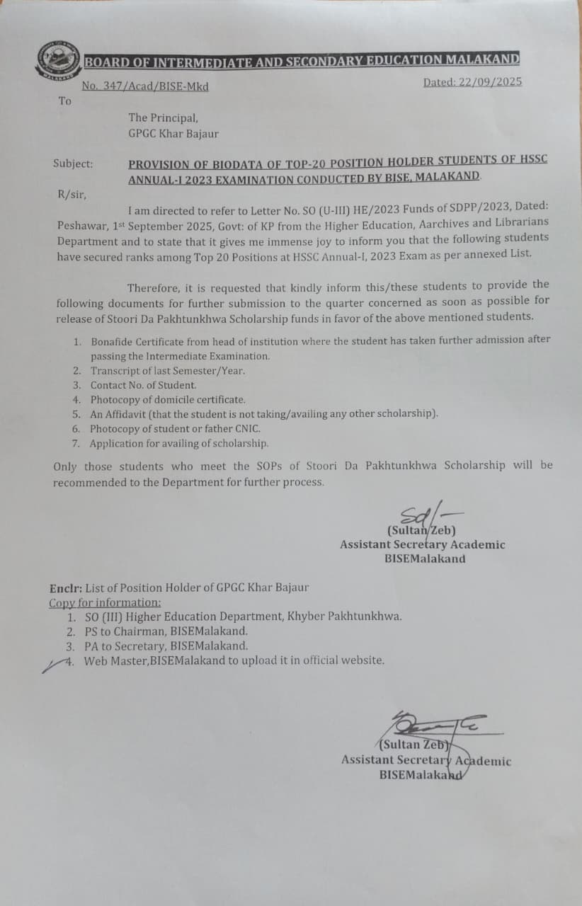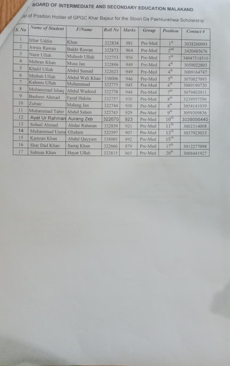 BIODATA OF TOP-20 POSITION HOLDERS STUDENTS: HSSC ANNUAL-I 2023